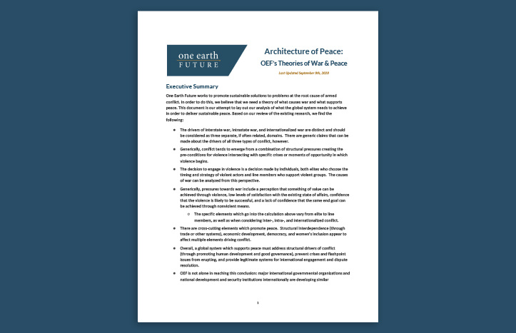 One Earth Future Foundation (OEF) is an incubator of innovative peacebuilding programs that designs, tests, and partners to scale programs that work hand-in-hand with those most affected by conflict to eliminate the root causes of war. We believe in a world beyond war, where sustainable peace is truly possible. One Earth Future incubates programs designed to foster sustainable peace, partnering with innovative world leaders, global development agencies and communities to see complex problems at the root of armed conflict in new ways and solve them together.