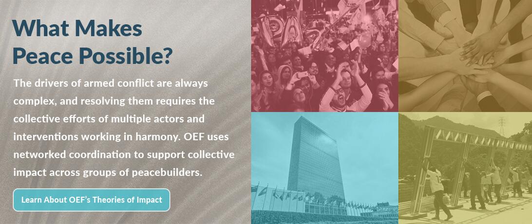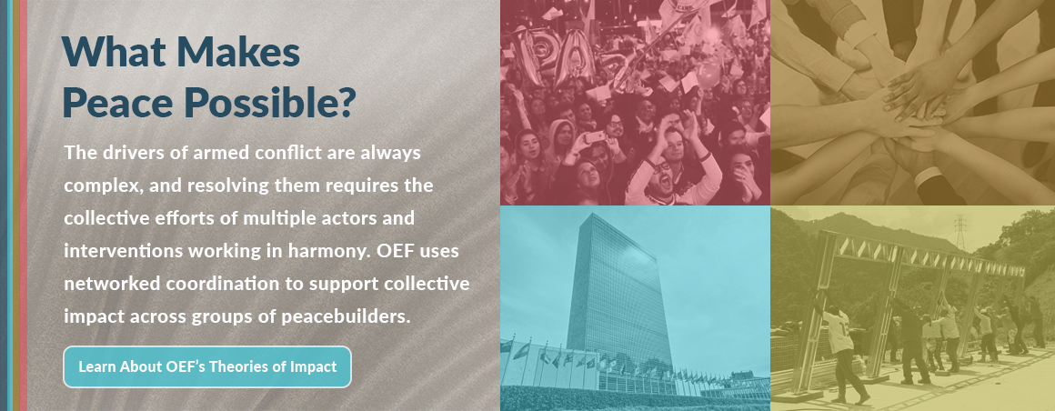 OEF’s work is based on some basic theories that guide our thinking in program design. The first, captured in our “Theory of Peace” is that all wars are caused by the combination of multiple pressures and sustainable peace requires working to address all of these pressures simultaneously. This means that peace will always require multiple organizations, from multiple different sectors, working together to deliver the conditions necessary for sustainable peace.