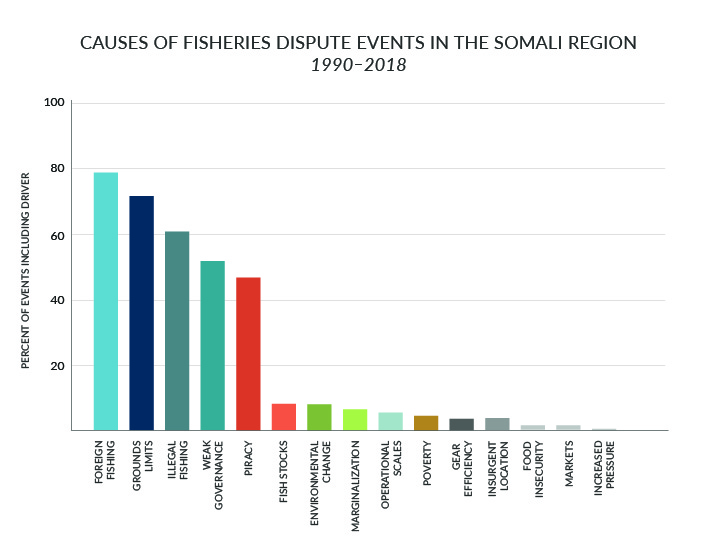The five primary causes of fisheries conflict in Somali waters were the presence and actions of foreign fishers (legal or otherwise), illegal fishing, low governance capacity to deal with fisheries conflicts, limitations on access to fishing grounds, and piracy.