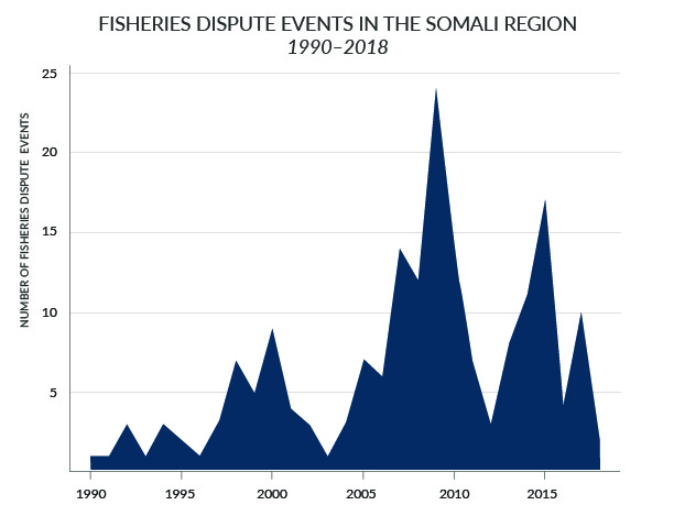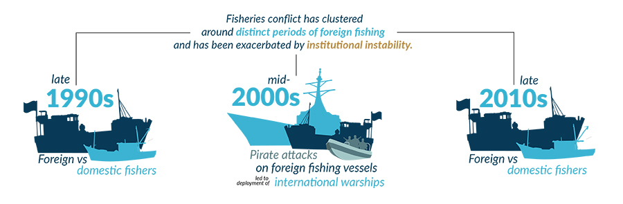 There were three distinct periods of conflict with different defining characteristics: conflict between domestic and foreign fishers (1998–2000), conflict driven by piracy in Somali waters (2007–2010), and conflict resulting from the return of foreign fishing fleets (2014–2015).