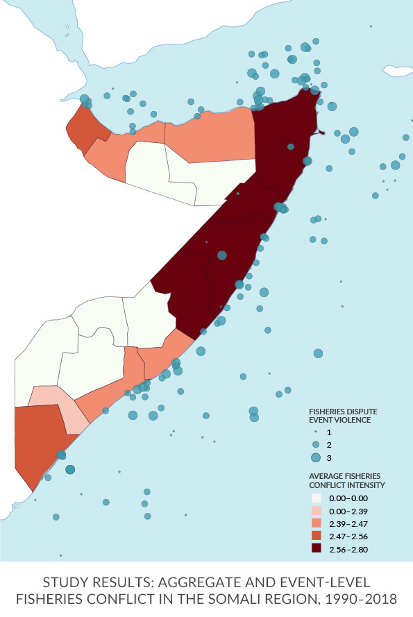By analyzing event-level conflict data collected from public news reports, we expanded upon our Fisheries Conflict Database. This database contains 186 discrete instances of fisheries conflict, called Fisheries Dispute Events (FDE), in Somali waters. Each entry contains information on the date, location, actors, drivers, and consequences of the FDE. Furthermore, we derived scores measuring the intensity of fisheries conflict, on a scale of 0 to 3, for each Somali region and each year of coverage.